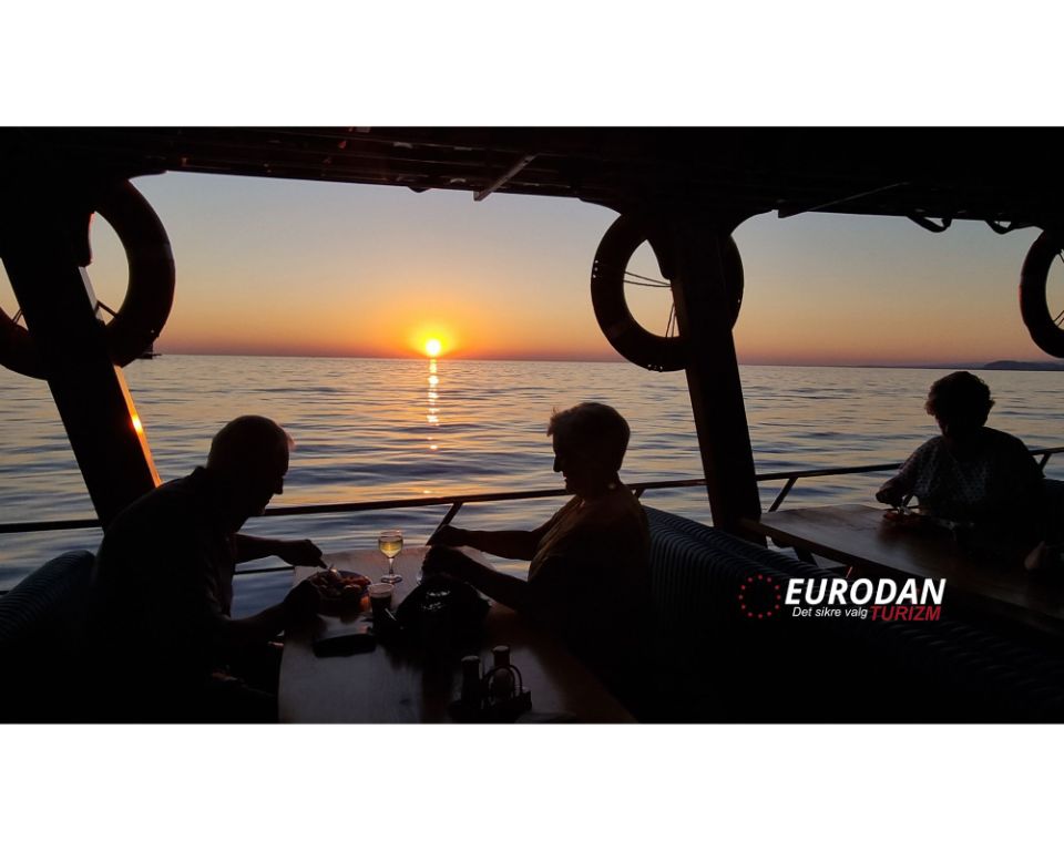 Nyd den smukke solnedgang fra havet, når vi sejler ud og nyder det sidste af dagens solstråler.
